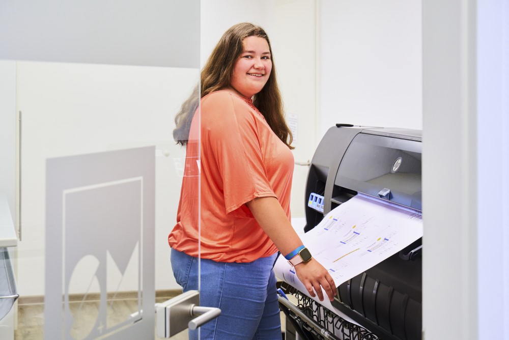 Standen früher Zeichenbrett, Lineal und Tuschefüller im Vordergrund, werden die Planunterlagen heute mit moderner EDV-Unterstützung erstellt und abschließend über einen Plotter (Drucker für große Papierformate) zu Papier gebracht.